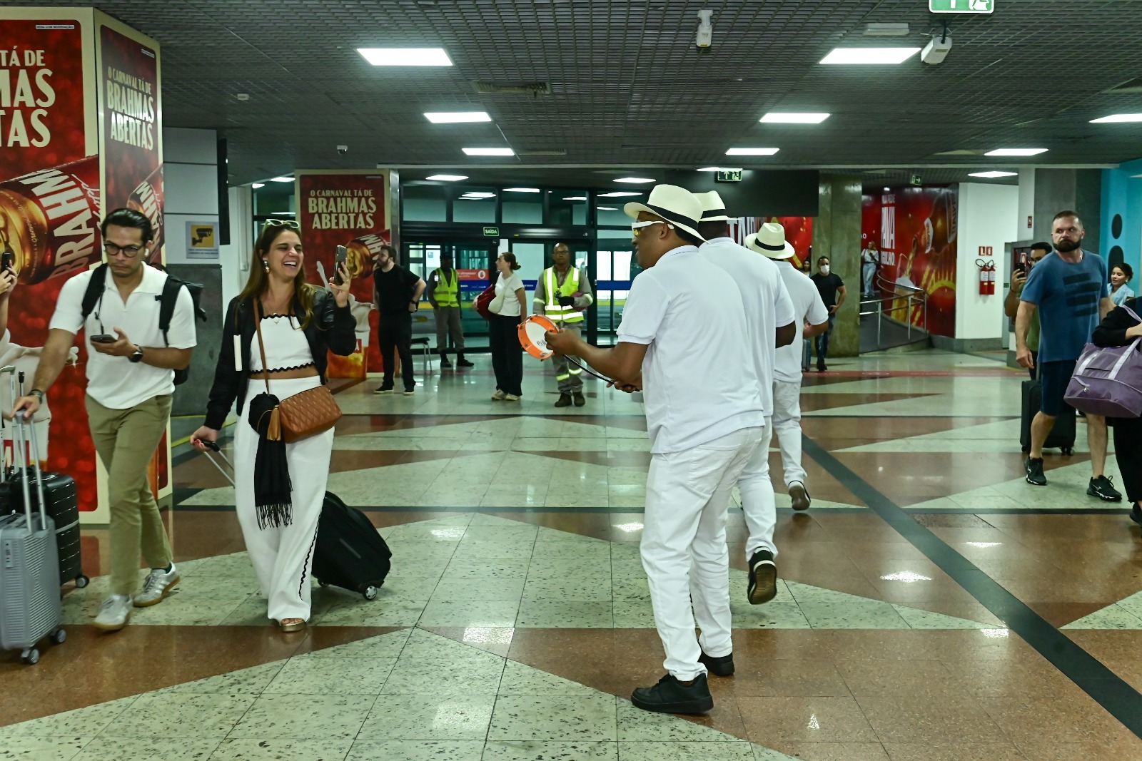 Apresentação – Com proposta cênica concebida para valorizar a identidade cultural da Bahia e surpreender quem desembarca na capital, o receptivo tem início com quatro sambistas posicionados em uma mesa no saguão, interpretando “Samba da Minha Terra”, de Dorival Caymmi.